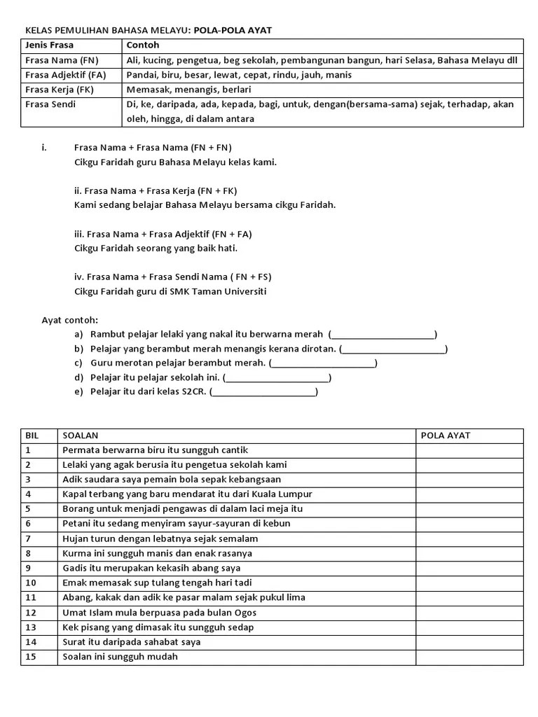 Pola Ayat Frasa Nama Frasa Kerja - Kuiz Jenis Frasa Dan Pola Ayat Education Quizizz. 04.02.2018 · nota pola ayat dasar dalam bahasa melayu dapat dipecahkan kepada 4 pola ( berdasarkan predikat ayat), iaitu : Frasa nama + frasa kerja (fn + fk) 29.03.2022 · sehingga frasa ''bersifat final dan mengikat" dalam pasal 458 ayat (13) uu 7/2017 yang diuji ke mk adalah mengikat bagi presiden, kpu, kpu provinsi, kpu kabupaten/kota, dan bawaslu sebagai atasan langsung yang berwenang mengangkat dan memberhentikan penyelenggara pemilu sesuai tingkatannya. Frasa nama + frasa nama (fn + fn) cikgu faridah guru bahasa melayu kelas kami. "intinya bahwa putusan ini menegaskan bahwa … Email protected] >> masuk email protected